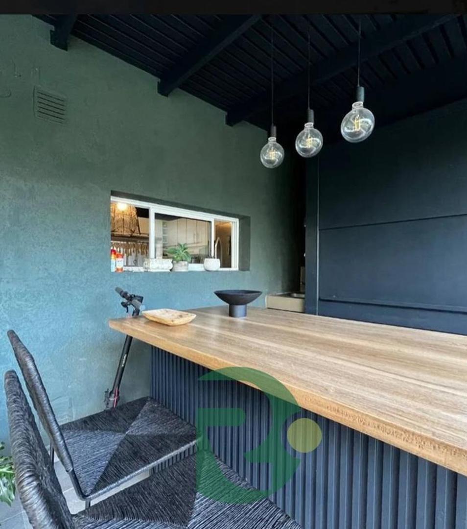 Galería semicubierta muy amplia, equipada con parrilla con cerramiento completo, barra y bacha.